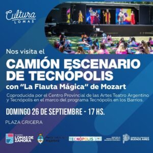 Este domingo 26 de septiembre a las 17, en la Plaza Grigera, Hipólito Yrigoyen al 8700, Lomas de Zamora, tendrá lugar la última presentación en partidos bonaerenses de la ópera “La flauta mágica” de Mozart, en castellano y adaptada para niñas, niños y jóvenes.