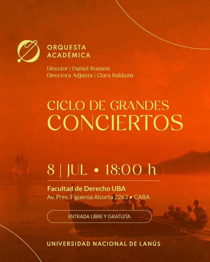 La Orquesta Académica de la Universidad Nacional Lanús (UNLa) de brindará un concierto gratuito en el Salón de Actos de la Facultad de Derecho de la UBA. La cita será el próximo sábado -8 de julio-, desde las 18, en Figueroa Alcorta 2263, Ciudad de Buenos Aires.