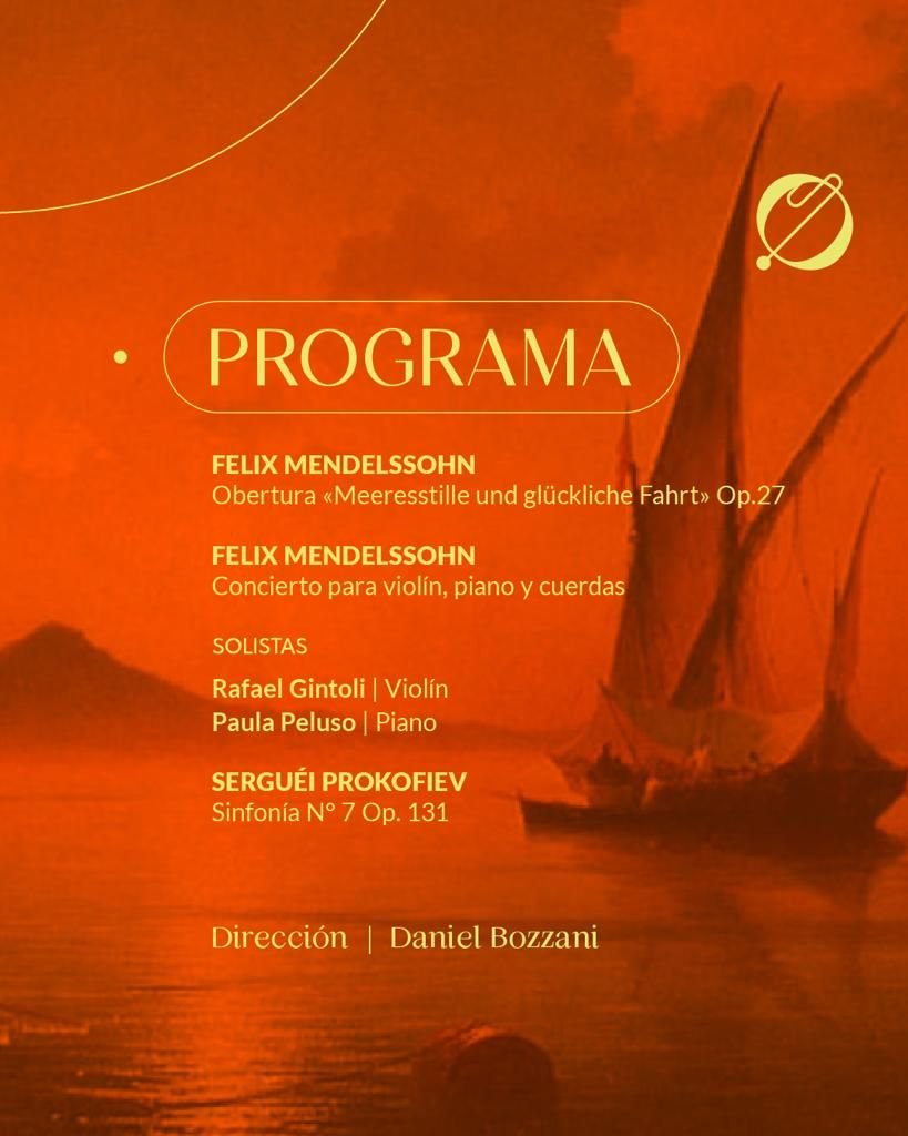 La presentación formará parte del “Ciclo de grandes conciertos” de Facultad de Derecho de la UBA y el programa incluirá dos obras esenciales de Felix Mendelsshon: la Obertura “Meeresstille und glücklicke Fahrt” Op. 27 y el Concierto para vilín, piano y cuerdas; con la presencia de la pianista Paula Peluso y violinista Rafael Gintoli, y bajo la dirección de Daniel Bozzani. También se interpretará la Sinfonía Nº7 Op. 131, de Serguéi Prokofiev.