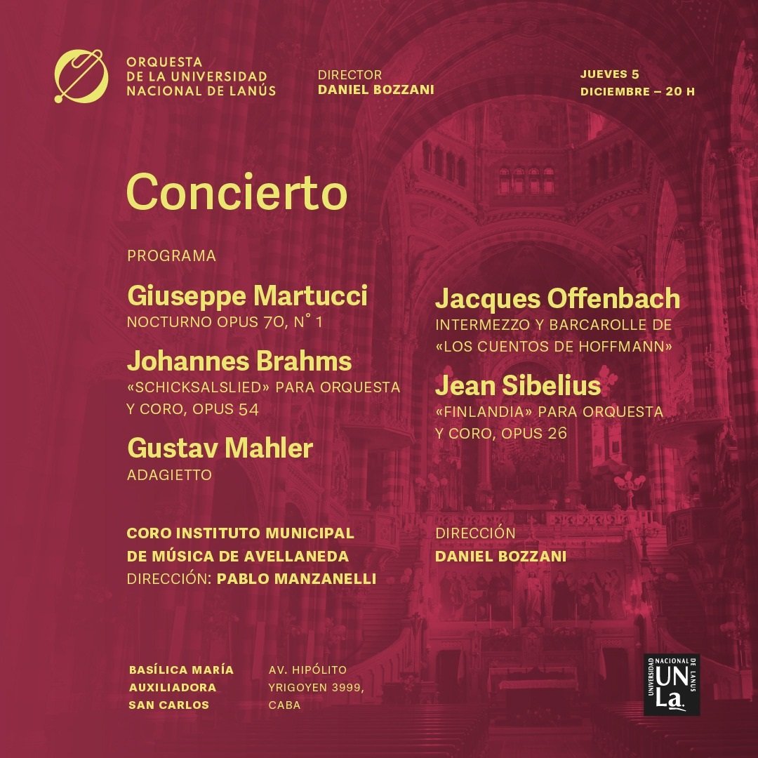 Este jueves 5 de diciembre, la Orquesta de la Universidad Nacional de Lanús (UNLa) dará su último concierto del año en un escenario emblemático: la Basílica San Carlos y María Auxiliadora, ubicada en Av. Hipólito Yrigoyen 3999, CABA. La cita será a las 20 -con entrada libre y gratuita- y promete una velada inolvidable, que combinará obras de destacados compositores con la participación del Coro del Instituto Municipal de Música de Avellaneda, bajo la dirección de Pablo Manzanelli.