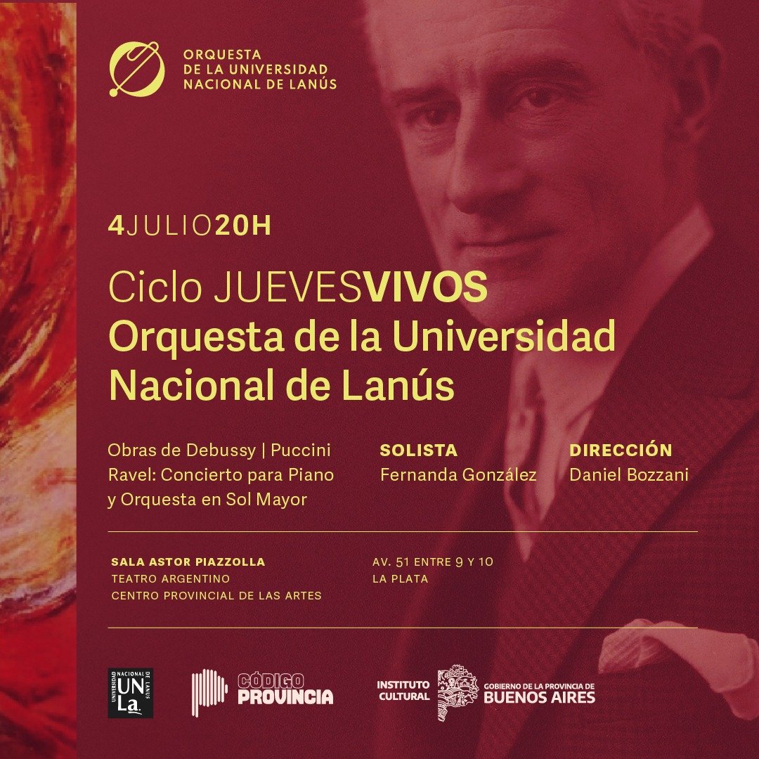 La presentación en el Teatro Argentino será con un concierto sinfónico donde se revivirá el impresionismo musical con dos obras de Claude Debussy: “Nuage” y “Petite Suite” y la brillantez del Concierto para Piano en Sol Mayor de Maurice Ravel, pieza que presenta un enorme virtuosismo y emotividad a cargo de la joven pianista Fernanda González. Cerrará el concierto un homenaje a Giacomo Puccini con el “Preludio Sinfónico”, una obra de gran profundidad expresiva y lirismo romántico. La dirección general de la Orquesta estará a cargo de su titular Daniel Bozzani, quien también es el rector de la UNLa.