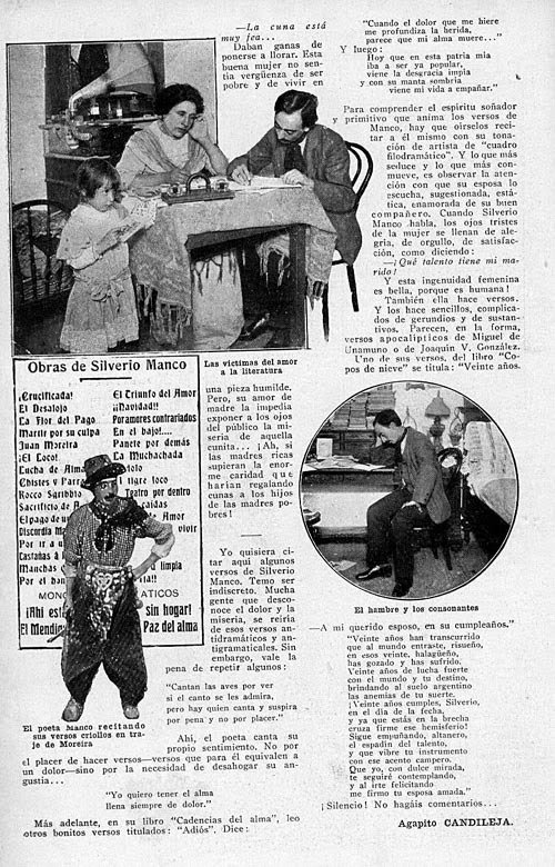“Abandona su oficio de peluquero para dedicarse al arte. Hay quienes le adjudican cierta militancia anarquista, pero lo cierto es que sus éxitos de payador se ubican en los primeros años de este siglo con el pseudónimo de ‘Cacique Viejo’ Resultó ganador del concurso organizado por el diario Crítica entre los años ‘21 y ‘22, cuyo dictamen dice: ‘El jurado especial encargado de dictaminar en el ‘Contrapunto Nacional’ organizado por ‘Crítica’, considerando que ‘Cacique Viejo’ es uno de los contrincantes que más actividad ha desplegado en el torneo, distinguiéndose por sus décimas morales y por su fecunda inteligencia, le declaran vencedor en este primer torneo gauchesco…’”, se lee en http://coleccionesteatrales.blogspot.com/