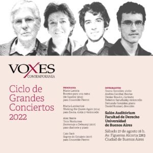Voxes Contemporánea, el ensamble de música contemporánea el ensamble de música contemporánea de la Universidad Nacional de Lanús (UNLa), se presentará en el marco del “Ciclo de Grandes Conciertos de la Facultad de Derecho de la UBA 2022. La cita será el próximo sábado -27 de agosto-, desde las 16, en Figueroa Alcorta 2263, Ciudad de Buenos Aires, con entrada libre y gratuita.