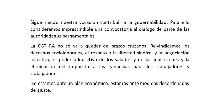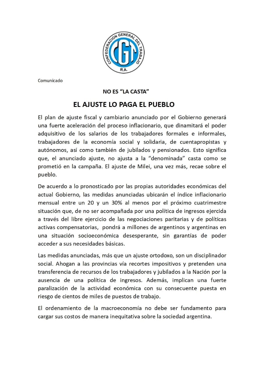 «No estamos ante un plan económico, estamos ante medidas desordenadas de ajuste», sostuvo la central sindical, que mantuvo una reunión de urgencia ante las medidas anunciadas por el ministro de Economía, Luis Caputo, que incluyen devaluación del peso, recortes en la administración pública y reducción de subsidios.