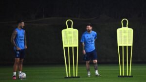 Messi, el goleador de la Argentina con tres tantos, fue uno de los últimos en salir del vestuario pero rápidamente se unió al grupo que empezó la jornada con una breve charla con Lionel Scaloni y el resto del cuerpo técnico.