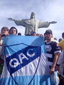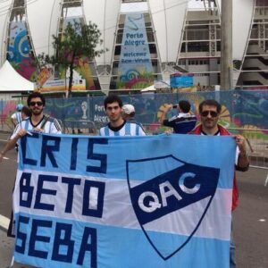 – Mundiales solo fui a Rusia y a Brasil. Es más, la historia de esta bandera de Quilmes nace en ese mundial. En 2014 fuimos a Brasil mi viejo, mi primo y yo, los tres somos los más futboleros de la familia. Y bueno, unos días antes de salir para Porto Alegre, El partido contra Nigeria era el primero al que íbamos, nos juntamos en mi casa, compramos la tela, los acrílicos e hicimos la bandera esa. Que en realidad, ese trapo media el Doble. De un lado tenía nuestros nombres (SEBA, BETO, CRIS) y del otro el escudo. Pero en el partido contra Nigeria, la policía brazuca no nos quería dejar entrarla, porque decía que era más grande los permitido con FIFA. Entonces mi viejo ahí en medio del cacheo, la corto con las manos y dijo “ahora son dos chiquitas”, el cana se rió y nos dejó pasar las dos mitades. Bueno, después de ese partido la llevamos por todo el Brasil hasta volver a Río para el partido contra Alemania, y ese ultimo pasito fue el que nos faltó para coronar la perfección.- El viaje fue inolvidable y ciertamente fue uno de los mejores que viví. 4 años más tarde, fuimos a Rusia, pero esta vez solo mi viejo y yo. Ya que mi primo tuvo un hijo (de más está decir que se sumó un cervecero más a la familia). Pero como era muy chico, decidió quedarse. y bueno, la bandera estuvo en los 4 partidos que jugó Argentina, Y sobre todo brilló nuevamente en un partido contra Nigeria, posándose sobre D10S y viralizándose.