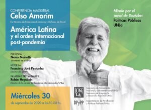 Celso Amorim, ex ministro de Relaciones Exteriores y de Defensa de Brasil, dará una conferencia magistral virtual sobre Latinoamérica y el orden internacional pospandemia. La actividad, organizada por la Universidad Nacional de Lanús (UNLa), es libre y gratuita tendrá lugar el próximo miércoles -30 de septiembre- a las 10, y podrá verse en directo por el canal de Youtube del Departamento de Políticas Públicas de la UNLa (https://bit.ly/3kWOsLW).