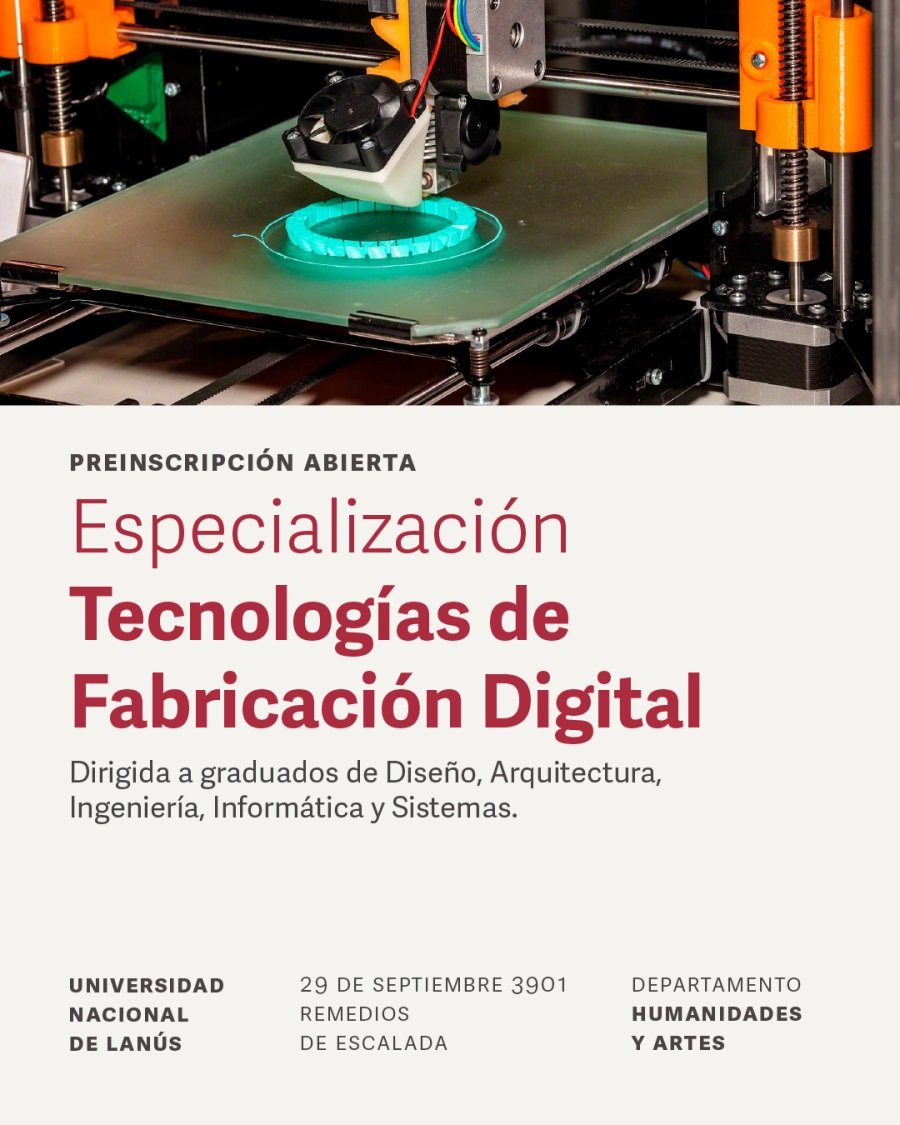 La Universidad Nacional de Lanús (UNLa) abrió la preinscripción para la primera cohorte de su Especialización en Tecnologías de Fabricación Digital, un programa de formación avanzada destinado a profesionales de diversas disciplinas. Las solicitudes estarán abiertas hasta el 20 de diciembre de 2024 y del 3 al 28 de febrero de 2025, con inicio de cursada en abril de 2025.