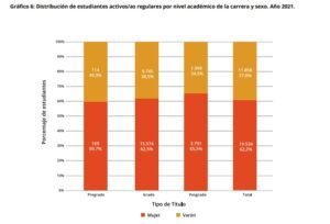 Otro dato significativo tiene que ver con la distribución por sexo. Del documento se desprende que el 62,2% del total de estudiantes regulares son mujeres (19.534) y los varones representan el 37,8% (11.858). La diferencia es aún mayor en los niveles académicos más elevados: en las carreras de grado, los porcentajes son 62,5% (15.574) y 37,5 (9.745); y en los posgrados, 65,5% (3.791) y 34,5% (1.999). En tanto que en las carreras de pre-grado, el porcentaje se equipara apenas: hay 59,7% de mujeres (169) y 40,3% de varones 40,3% (114).