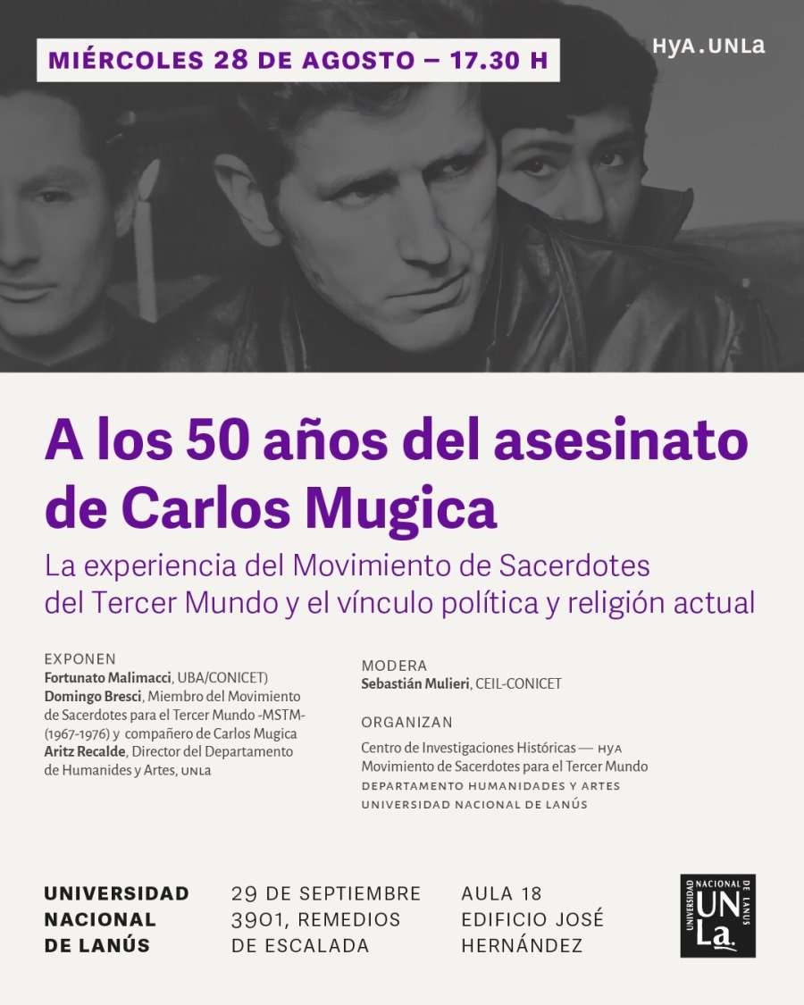 La Universidad Nacional de Lanús (UNLa) homenajeará a Carlos Mugica a 50 años de su asesinato. Para ello, se realizará la charla abierta a la comunidad “A los 50 años del asesinato de Carlos Mugica: La experiencia del Movimiento de Sacerdotes por el Tercer Mundo y el vínculo política y religión actual”. La cita tendrá lugar el próximo miércoles -28 de agosto-, desde las 17.30, en el aula 18 del edificio José Hernández (29 de Septiembre 3901, Remedios de Escalada).