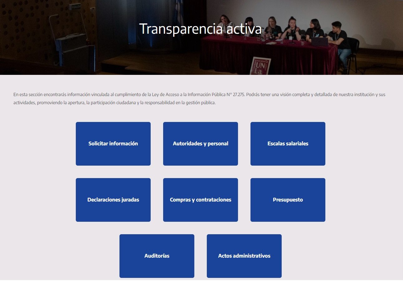 Allí, en el apartado referido a la transparencia activa, pueden encontrarse datos precisos sobre el organigrama de autoridades y la cantidad de personal con sus respectivas categorías y escalafón; las escalas salariales actualizadas de los docentes y nodocentes; datos acerca de compras y contrataciones, presupuesto, auditorías, actos administrativos y declaraciones juradas. Incluso hay un botón para solicitar más información.