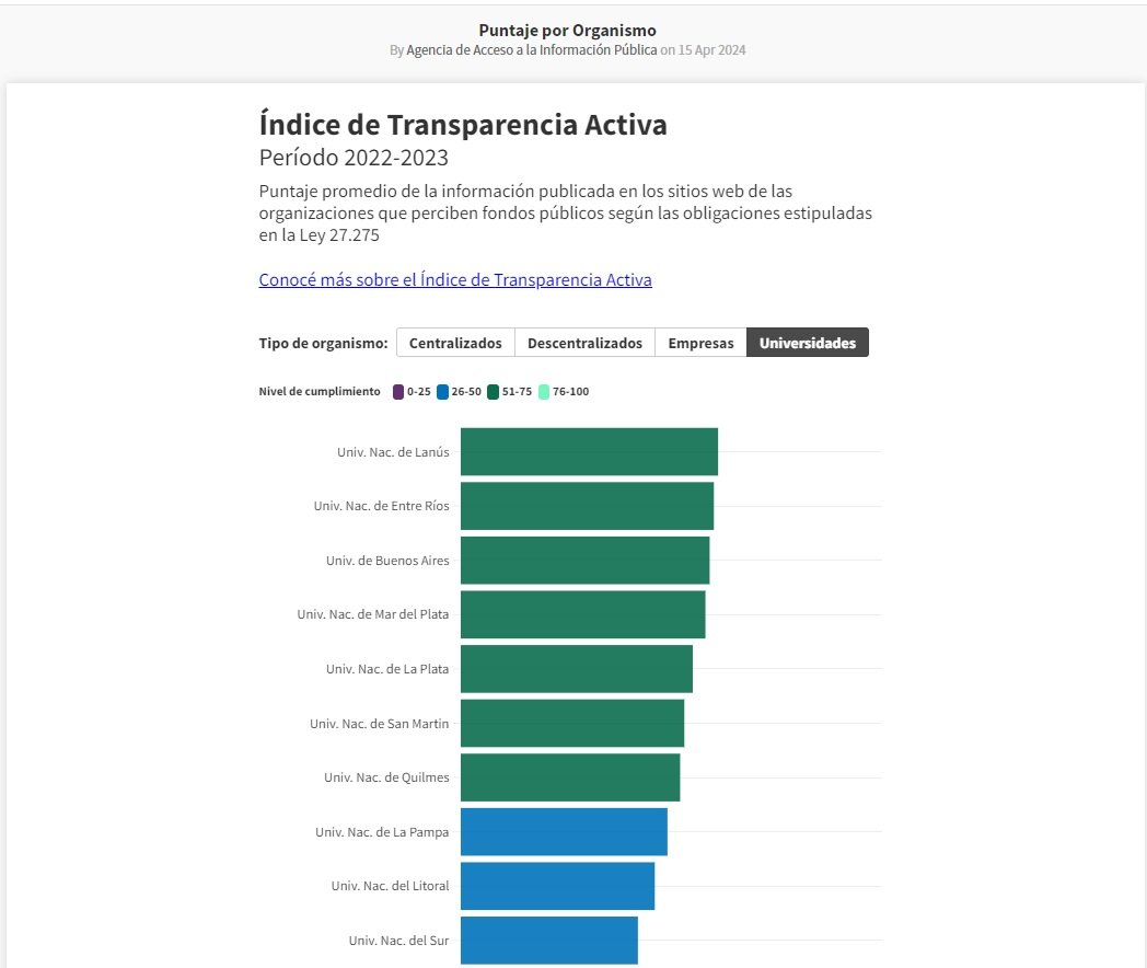 Con un puntaje de 61/100, la UNLa lidera el ranking de transparencia entre las 55 universidades nacionales públicas. Completan los 10 primeros lugares las de Entre Ríos (60/100), UBA (59/100), Mar del Plata (58/100), La Plata (55/100), San Martín (53/100), Quilmes (52/100), La Pampa (49/100), Litoral (46/100) y del Sur (42/100).