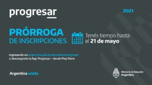 El Ministerio de Educación de la Nación anuncia la prórroga del plazo de inscripción a las Becas Progresar para sus líneas «Finalización de la Educación Obligatoria”, “Fomento de la Educación Superior” y “Fomento de la Educación Superior en Enfermería” hasta el 21 de mayo del 2021.