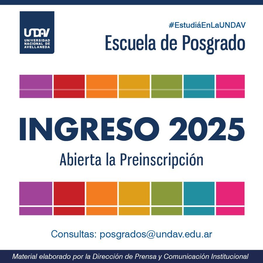 La Universidad Nacional de Avellaneda (UNDAV), a través de su Escuela de Posgrado, dependiente de la Secretaría de Investigación y Vinculación Tecnológica e Institucional, informa que se encuentra abierta la inscripción a las carreras de posgrado para el ciclo 2025. La propuesta formativa consta de las siguientes carreras: