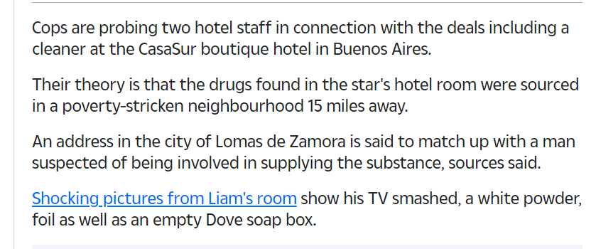 Según se detalló en The Sun, se evalúa que, en un estado de vulnerabilidad, Payne haya sido víctima del personal del hotel que le suministró las drogas. Según publicó este lunes el diario ABC News, el cantante habría consumido “tusi” (una mezcla de varias sustancias como MDMA, ketamina y 2C-B), cocaína, benzodiazepina y crack.