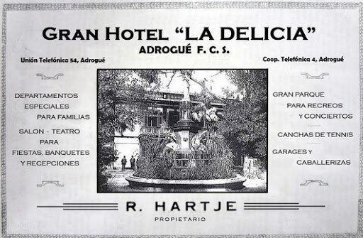 Incluso la calle que hoy se llama Esteban Adrogué fue conocida durante años como «La Delicia» debido a que iba desde la estación hasta la entrada del hotel. La misma fue trazada por Esteban Adrogué para la comodidad de los turistas que venían a alojarse en las instalaciones. Esta calle pasó a llevar el nombre del fundador del partido de Almirante Brown hacia 1893.