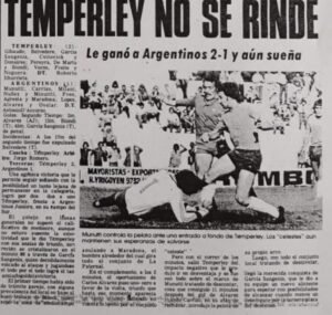 “Victoria agónica por 2-1 ante el equipo de Diego Maradona, fue un triunfo que le odió la posibilidad de ir a Santa Fe por la última fecha con chances de empatar la línea de Lanús y Platense y forzar un desempate. Mariano Biondi (último gol en Temperley) y el Topo Juan Carlos García Sangenis en una victoria titánica”, resume en un recuerdo el Departamento Histórico y Museo del Club Atlético Temperley.