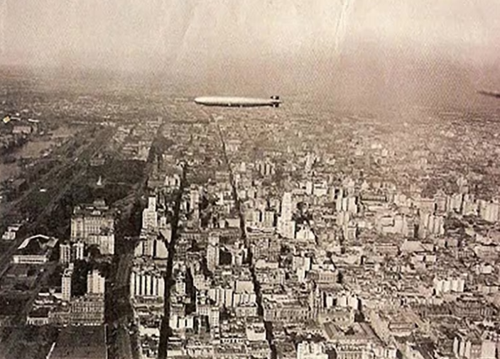 El dirigible que a los pocos minutos de asomarse por el Sur llegó a la Capital Federal impuso su porte sobre: la avenida Alem, las calles 25 de Mayo, Reconquista y San Martín. El edificio Central de Correos y el edificio de la Aduana.