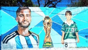 En la obra puede verse una imagen actual de Tagliafico, a la Copa del Mundo obtenida y también una imagen del futbolista cuando era chico y vestía los colores del Club Atlético y Social Villa Calzada.