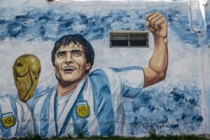 En este caso la obra fue realizada por los artistas locales Gabo y TiN y en ella están representadas las figuras de los futbolistas levantando la copa, envueltos en una bandera celeste y blanca.