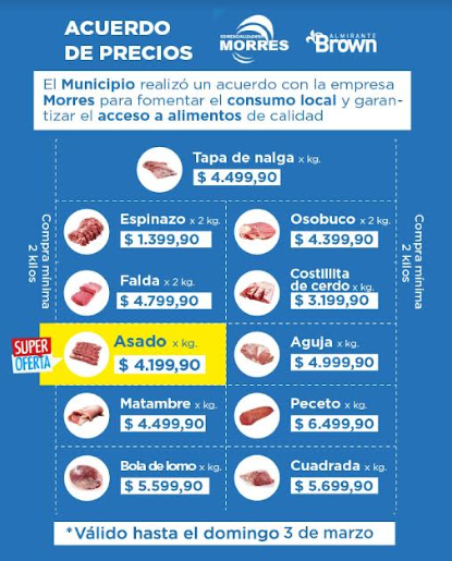 Se trata de acuerdo que rige entre la Comuna browniana y la empresa comercializadora “Morres” el cual arrancó a fines de diciembre y es aplicable en sus sucursales en las localidades de Burzaco, Glew, Claypole y Longchamps para una amplia variedad de cortes comprando dos kilos de mercadería por cada vecino.