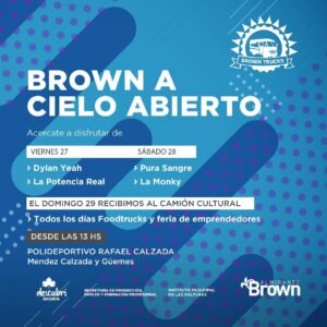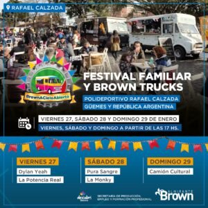 El Municipio de Almirante Brown llevará adelante este viernes 27, sábado 28 y domingo 29 de enero el festival familiar «Brown a Cielo Abierto» en el parque de la Estación de Rafael Calzada que incluirá Food Trucks, juegos, shows, la presencia del Camión Cultural y un cierre de lujo a cargo de «El Bordo».