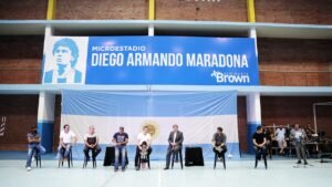 El intendente de Almirante Brown, Mariano Cascallares y los campeones del mundo Héctor (El Negro) Enrique, Julio (El Vasco) Olarticoechea, Carlos Daniel (Chino) Tapia y Sergio (Checho) Batista, encabezaron una emotiva ceremonia durante la cual le impusieron el nombre de DIEGO ARMANDO MARADONA al Microestadio del Polideportivo Municipal de ese distrito bonaerense en homenaje al mejor jugador de fútbol de la historia.
