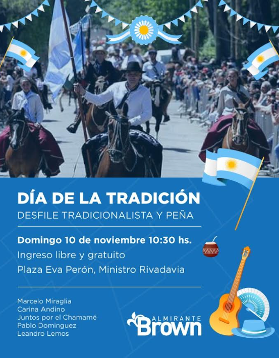 El Municipio de Almirante Brown invitó a las vecinas y vecinos de nuestro distrito a participar de la celebración por el Día de la Tradición que se realizará este domingo 10 de noviembre en la localidad de Ministro Rivadavia.