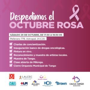 El Municipio de Almirante Brown informó que, en el marco de las acciones llevadas adelante durante el mes de la Lucha contra el Cáncer de Mama, este sábado 29 de octubre se realizará una jornada de concientización a través de diversas expresiones artísticas.