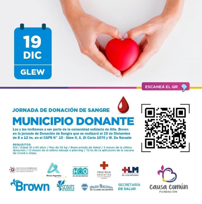 El Municipio de Almirante Brown informó que llevará adelante este jueves 19 de diciembre una nueva jornada de donación de sangre en la localidad de Glew, en articulación con la Fundación “Causa Común” y los hospitales provinciales Arturo Oñativia y Lucio Meléndez.