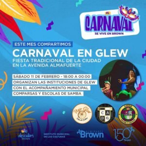 Luego, el sábado 11, de 18 a 00 horas, se realizará la Fiesta Tradicional en la avenida Almafuerte de Glew con shows de comparsas y escolas do samba, en una actividad organizada por las instituciones locales y el Municipio de Almirante Brown.