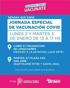 El Municipio de Almirante Brown llevará adelante este lunes 2 y martes 3 de enero dos nuevas jornadas de vacunación itinerantes en las localidades de Longchamps y San José.