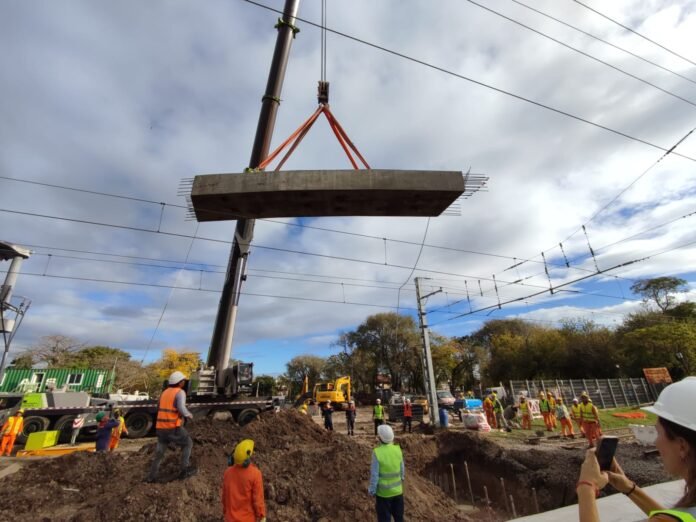Los trabajos -que ejecutan el Ministerio de Obras Públicas de Nación y Trenes Argentinos Infraestructura- se realizan a través de la excavación, creación y nivelación de los pilotes de hormigón que serán la estructura base para sostener las vías del ferrocarril, en el marco de una obra estructural que descongestionará el tránsito de toda la zona brindando mayor fluidez y accesibilidad.