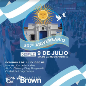 El Municipio de Almirante Brown invitó a las vecinas y los vecinos de nuestro distrito a participar de la Ceremonia Oficial y el Desfile Patrio que realizará este domingo 9 de julio en el marco del 207° aniversario de la declaración de la Independencia Nacional.