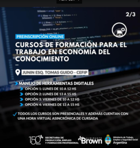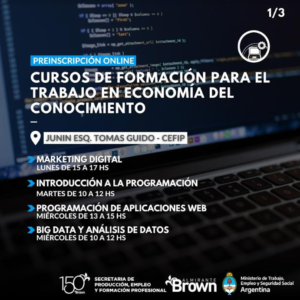 El Municipio de Almirante Brown informó que se encuentra abierta la preinscripción online a los Cursos de Formación para el Trabajo en Economía del Conocimiento, con el objetivo de seguir brindando herramientas y capacitaciones a los vecinos y vecinas del distrito.