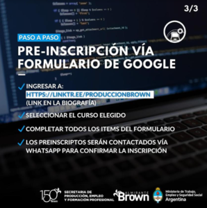 Desde la Secretaría de Producción, Empleo y Formación Profesional local explicaron que las preinscripciones se realizan de forma online a través del siguiente link https://linktr.ee/produccionbrown, donde podrán elegir el curso e informarse sobre sus correspondientes días y horarios.
