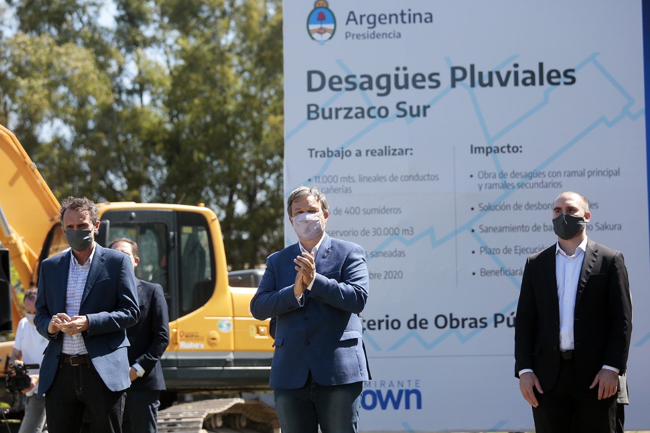 El ministro de Obras Públicas de la Nación y el intendente de Almirante Brown, Mariano Cascallares, pusieron en marcha la obra «Desagües Pluviales Burzaco Sur» que contempla el saneamiento de unas 320 hectáreas beneficiando a 65 mil vecinas y vecinos de Longchamps y Burzaco.