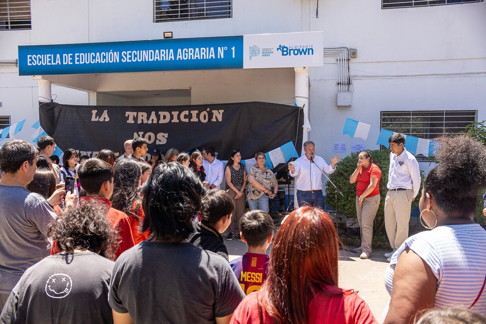 El intendente de Almirante Brown, Mariano Cascallares, visitó la Escuela de Educación Secundaria Agraria N° 1 ubicada en Glew (límite con Ministro Rivadavia) donde además de participar de la tradicional peña folklórica, anunció a la comunidad educativa los detalles de un importante plan de obras para la ampliación de esa institución.