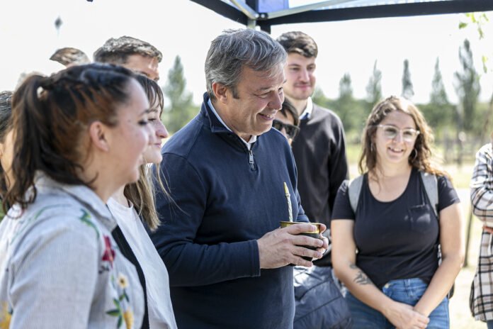Mariano Cascallares, el intendente interino de Almirante Brown, Juan Fabiani, y la directora del Instituto Nacional de Juventudes (Injuve), Julia Epstein, compartieron un encuentro al aire libre en la Granja Educativa Municipal con estudiantes del sexto año de escuelas secundarias del distrito para celebrar la llegada de la primavera.