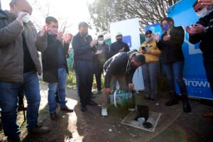 Posteriormente, se trasladaron unos metros hasta las casas de Walter y Pablo, dos vecinos del barrio, donde concretaron la inauguración simbólica de la nueva red cloacal que beneficiará directamente a 2.400 vecinos y vecinas.