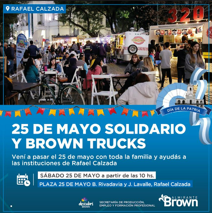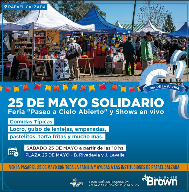 El Municipio de Almirante Brown llevará adelante una importante actividad solidaria este sábado 25 de Mayo en la localidad de Rafael Calzada, en el marco de la conmemoración por el 214° Aniversario de la Revolución de Mayo, que incluirá comidas típicas y shows en vivo.
