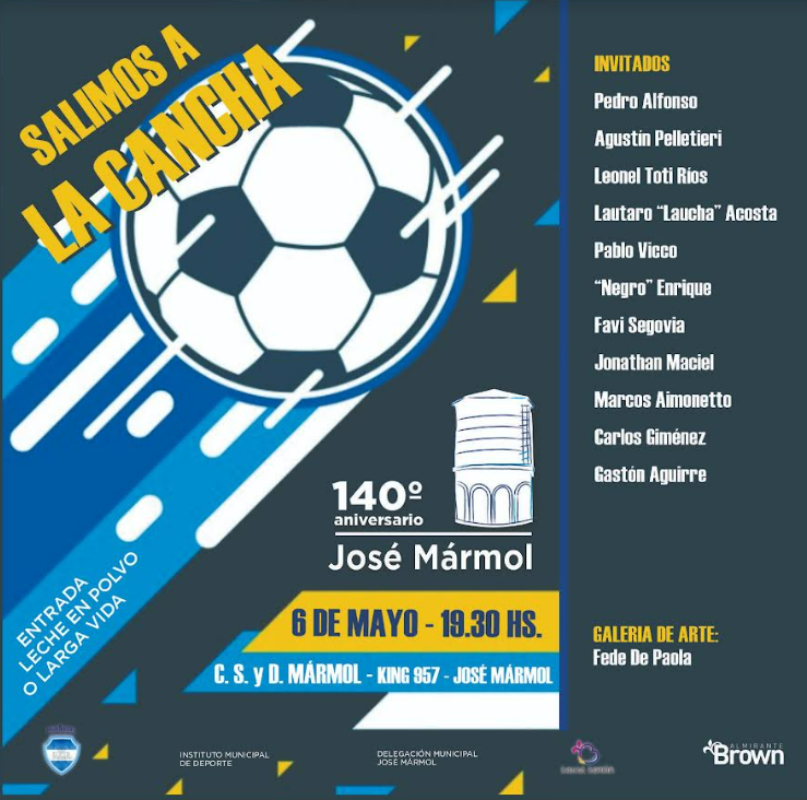El Municipio de Almirante Brown llevará adelante este lunes 6 de mayo la iniciativa “Salimos a la Cancha”, un encuentro futbolístico solidario en el mítico Club Social y Deportivo José Mármol, también conocido como “Club King”, que contará con la presencia de futbolistas destacados en el marco de las actividades por la Semana de la Identidad Cultural de José Mármol.