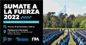 El Municipio de Almirante Brown convocó a todas las vecinas y los vecinos interesados en sumarse a la Policía de la Provincia de Buenos Aires para el Ciclo Lectivo 2022, a acercarse y participar de una Jornada de Inscripción y Charla Informativa que tendrá lugar mañana viernes 17 de diciembre en el Polideportivo Municipal de Ministro Rivadavia.