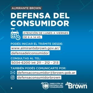 Se indicó que Defensa del Consumidor del Municipio de Almirante Brown atiende al público de lunes a viernes de 8 a 14 horas. Tiene disponibles la línea telefónica 5034-6200 internos 211 / 212 y 213.