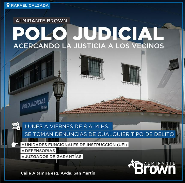 El Municipio de Almirante Brown informó que, gracias a la articulación con el Ministerio Público de la Provincia de Buenos Aires, se puso en funcionamiento el nuevo Polo Judicial de Almirante Brown en la localidad de Rafael Calzada, donde los vecinos y vecinas pueden realizar denuncias, entre otros importantes servicios.