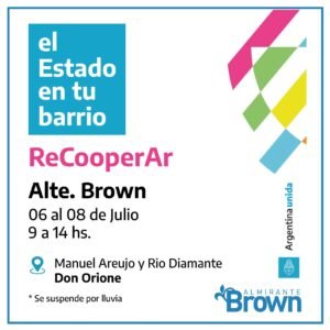 El Municipio de Almirante Brown anunció que durante tres jornadas de esta semana –desde este martes 6 hasta el jueves 8 de julio inclusive- el programa “El Estado en tu Barrio” llega de 9 a 14 horas a la intersección de las calles Manuel Araujo y Río Diamante de Don Orione con servicios para las vecinas y los vecinos.