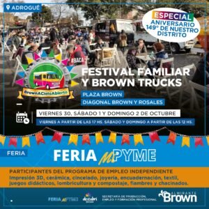 En efecto, este viernes 30 de septiembre, el sábado 1 y el domingo 2 de octubre, la tradicional iniciativa llega a la plaza Brown de Adrogué (Diagonal Brown y Rosales) con shows en vivo y diversas actividades de esparcimiento y acompañada además por la variada oferta gastronómica que ofrecen los Brown Food trucks.