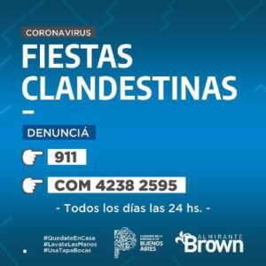 Desde la Comuna browniana indicaron que durante todo el fin de semana se recibieron más de 20 llamados alertando sobre reuniones masivas, de las cuales siete fueron confirmadas y desarticuladas en las localidades de Rafael Calzada, Claypole, Glew, Solano y Longchamps; en este último caso se trató de una fiesta clandestina con 100 personas.