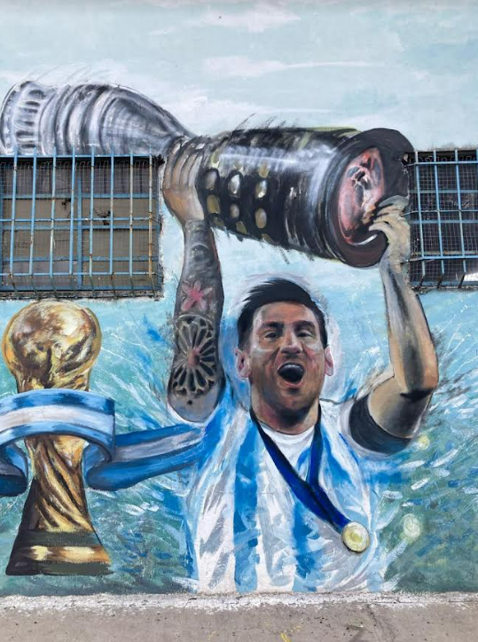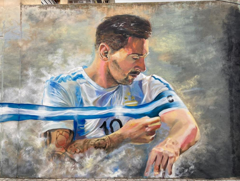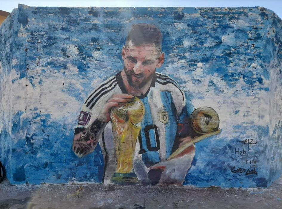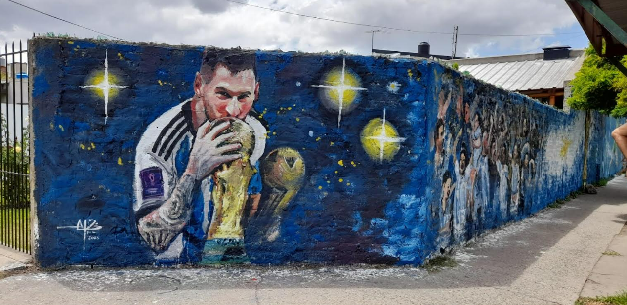 El homenaje con forma de mural llegó también hasta la avenida Monteverde N° 7782 de Burzaco donde aparece el mejor jugador de mundo concentrado frente a una final. Y frente al Hospital Arturo Oñativia (calle Jorge y Santiago del Estero) aparece el mural de Messi besando la Copa del Mundo en Qatar.