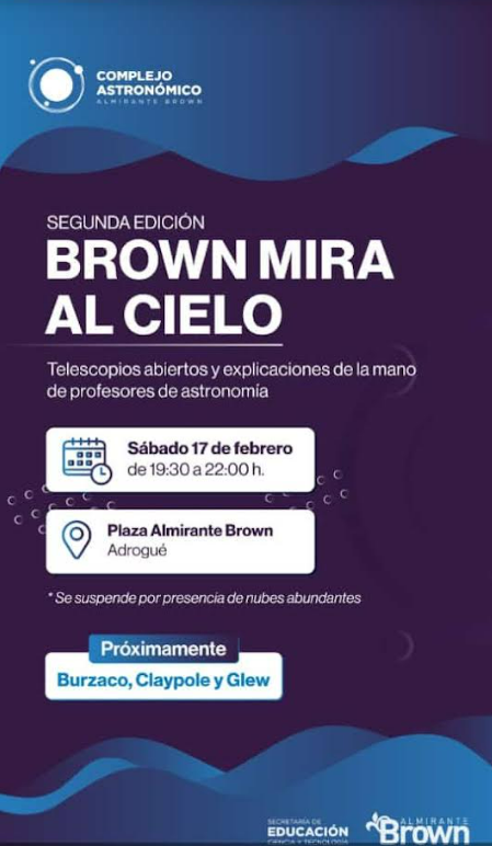 El Municipio de Almirante Brown informó que en el marco de las diferentes actividades que se desarrollan durante las vacaciones de verano, este sábado 17 de febrero, una vez más, las vecinas y los vecinos del distrito podrán observar y conocer el cielo nocturno a través de telescopios abiertos en la plaza “Brown” de Adrogué. La jornada se suspende en caso de presencia de nubes abundantes.